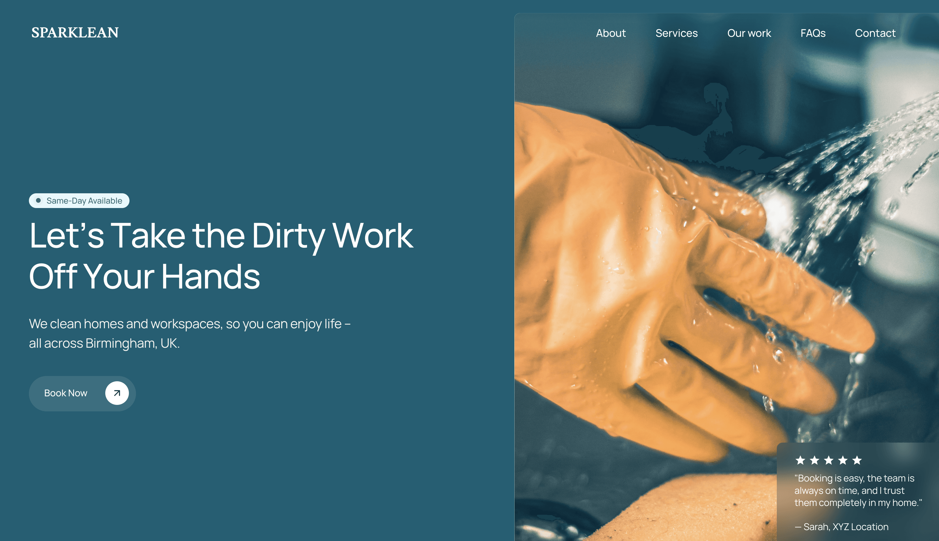 Sparklean is a residential and commercial cleaning company based in Birmingham, UK, offering same-day availability and a full range of cleaning services for homes and workplaces. The brand exists to “take the dirty work off your hands,” helping people feel calmer, healthier, and more at home in their spaces. The website positions Sparklean as a friendly, reliable, and detail‑driven partner that goes beyond basic tidying to create fresh, organised environments supported by strong social proof, clear service breakdowns, and straightforward calls to action.